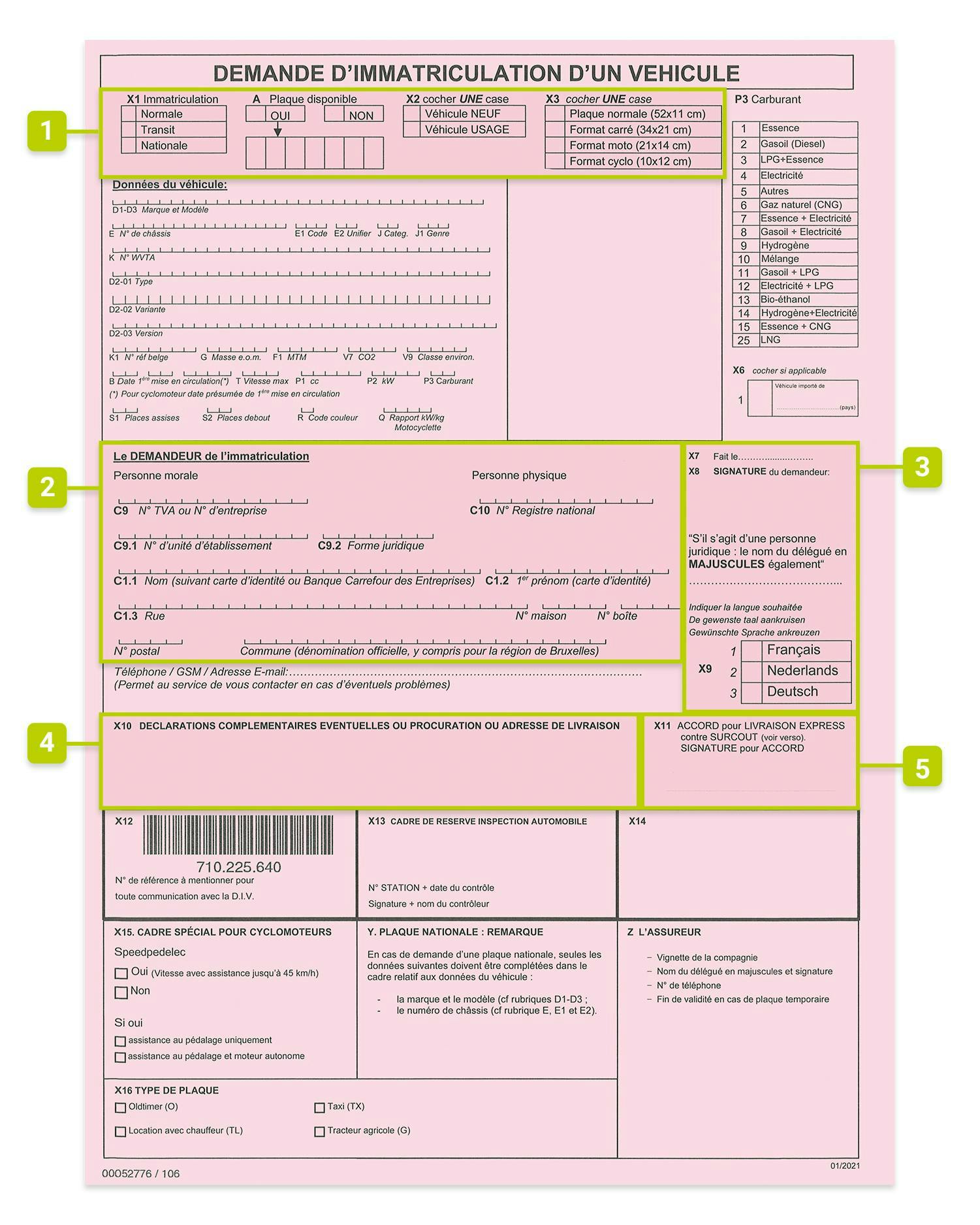 Le formulaire rose « Demande d’immatriculation d’un véhicule », aussi appelé formulaire d’immatriculation.